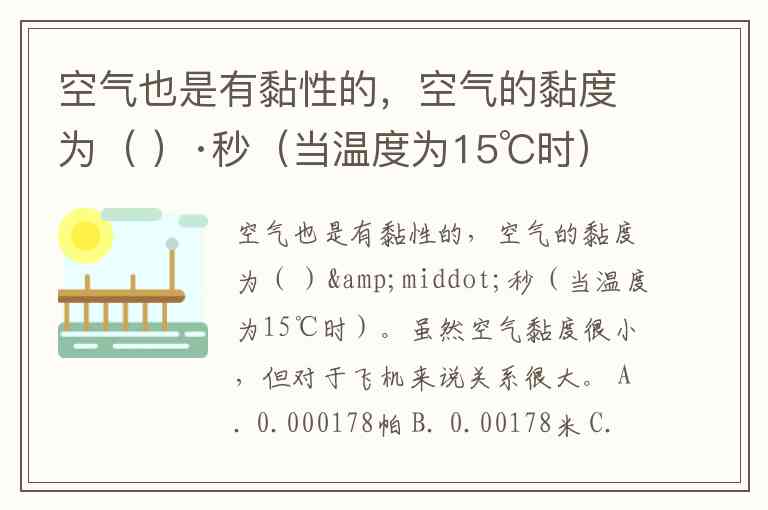 空气也是有黏性的,空气的黏度为( )·秒(当温度为15℃时)。虽然空气黏度很小,但对于飞机来说关系很大。 A. 0.000178帕 B. 0.00178米 C. 0.0178米