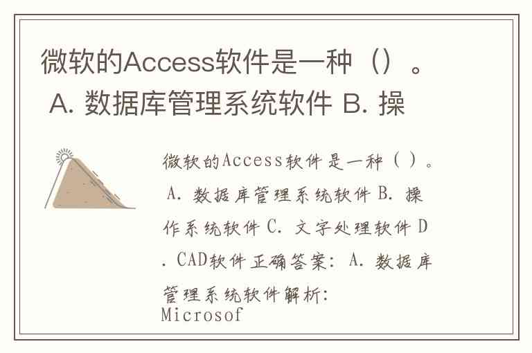 微软的Access软件是一种()。 A. 数据库管理系统软件 B. 操作系统软件 C. 文字处理软件 D. CAD软件