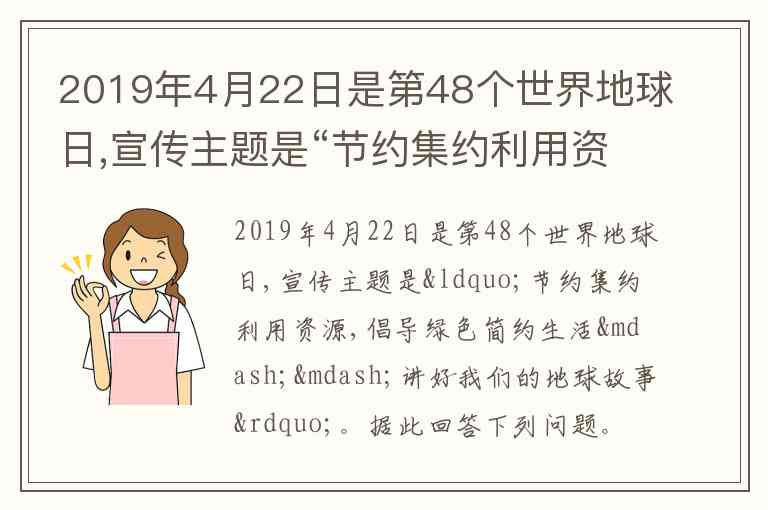 2019年4月22日是第48个世界地球日,宣传主题是“节约集约利用资源,倡导绿色简约生活——讲好我们的地球故事”。据此回答下列问题。 (1)下列属于自然资源的是( ) A. 日用商品 B. 水资源 C. 工业产品 D. 粮食作物