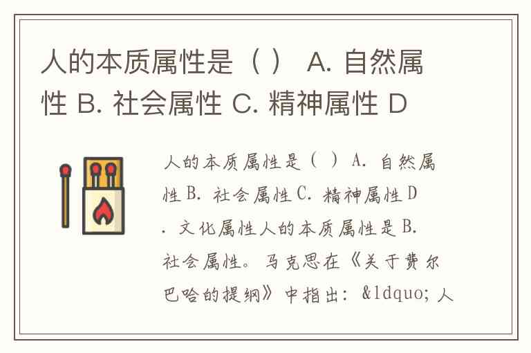 人的本质属性是( ) A. 自然属性 B. 社会属性 C. 精神属性 D. 文化属性