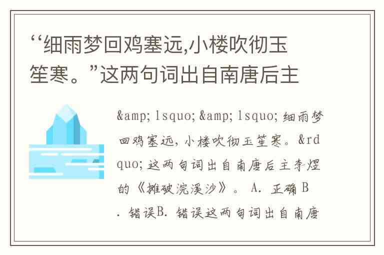 ‘‘细雨梦回鸡塞远,小楼吹彻玉笙寒。”这两句词出自南唐后主李煜的《摊破浣溪沙》。 A. 正确 B. 错误