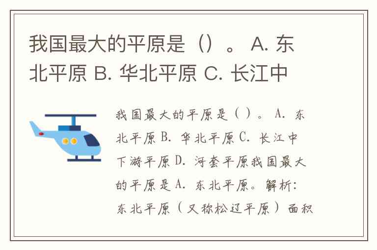 我国最大的平原是()。 A. 东北平原 B. 华北平原 C. 长江中下游平原 D. 河套平原