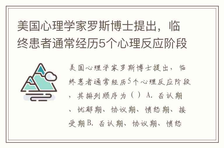 美国心理学家罗斯博士提出,临终患者通常经历5个心理反应阶段,其排列顺序为() A. 否认期、忧郁期、协议期、愤怒期、接受期 B. 否认期、协议期、愤怒期、接受期、忧郁期 C. 否认期、愤怒期、协议期、忧郁期、接受期 D. 忧郁期、愤怒期、否认期、协议期、接受期 E. 忧郁期、否认期、愤怒期、协议期、接受期