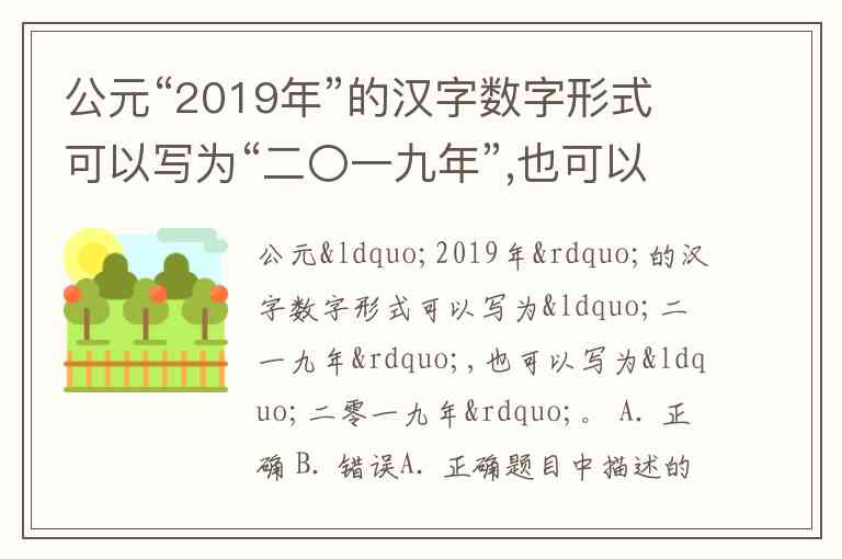 公元“2019年”的汉字数字形式可以写为“二〇一九年”,也可以写为“二零一九年”。 A. 正确 B. 错误