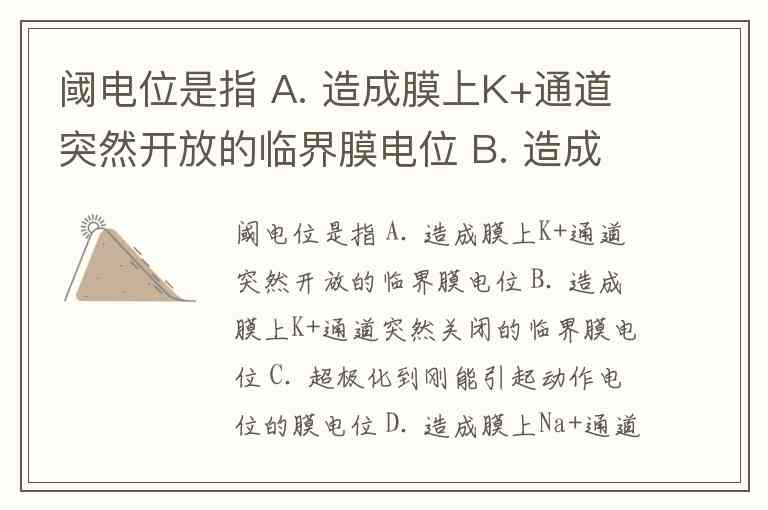 阈电位是指 A. 造成膜上K+通道突然开放的临界膜电位 B. 造成膜上K+通道突然关闭的临界膜电位 C. 超极化到刚能引起动作电位的膜电位 D. 造成膜上Na+通道大量开放的临界膜电位 E. 造成膜上Na+通道突然关闭的临界膜电位