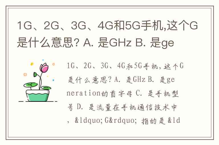 1G、2G、3G、4G和5G手机,这个G是什么意思? A. 是GHz B. 是generation的首字母 C. 是手机型号 D. 是流量