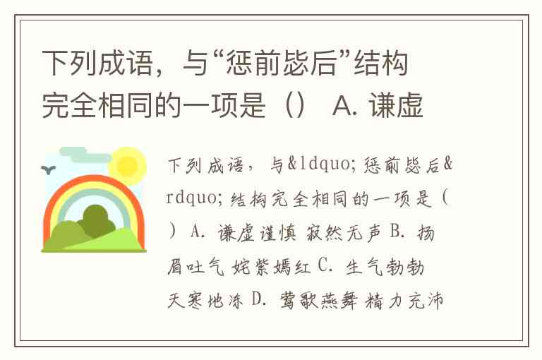 下列成语,与“惩前毖后”结构完全相同的一项是() A. 谦虚谨慎 寂然无声 B. 扬眉吐气 姹紫嫣红 C. 生气勃勃 天寒地冻 D. 莺歌燕舞 精力充沛