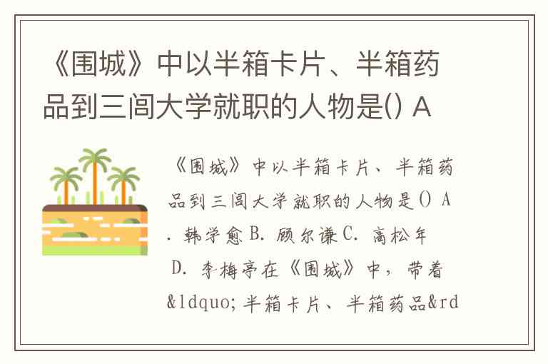 《围城》中以半箱卡片、半箱药品到三闾大学就职的人物是() A. 韩学愈 B. 顾尔谦 C. 高松年 D. 李梅亭