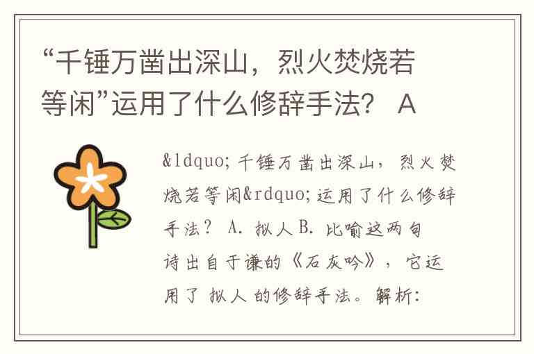 “千锤万凿出深山,烈火焚烧若等闲”运用了什么修辞手法? A. 拟人 B. 比喻