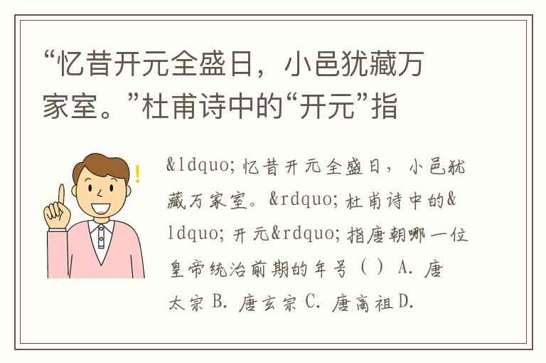“忆昔开元全盛日,小邑犹藏万家室。”杜甫诗中的“开元”指唐朝哪一位皇帝统治前期的年号() A. 唐太宗 B. 唐玄宗 C. 唐高祖 D. 武则天
