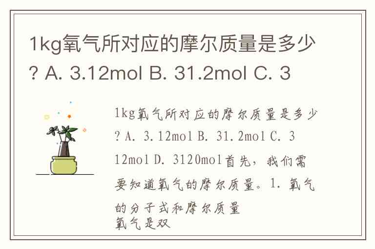 1kg氧气所对应的摩尔质量是多少? A. 3.12mol B. 31.2mol C. 312mol D. 3120mol