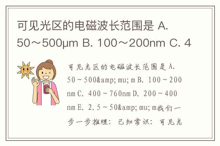 可见光区的电磁波长范围是 A. 50~500μm B. 100~200nm C. 400~760nm D. 200~400nm E. 2.5~50μm