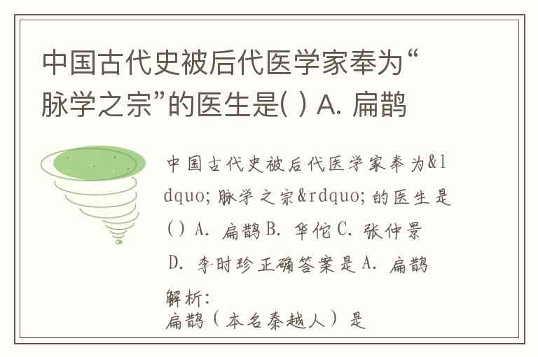 中国古代史被后代医学家奉为“脉学之宗”的医生是( ) A. 扁鹊 B. 华佗 C. 张仲景 D. 李时珍