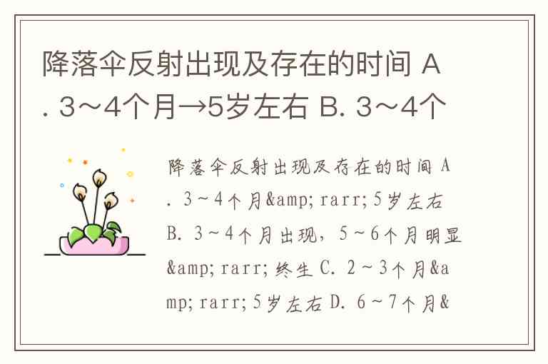 降落伞反射出现及存在的时间 A. 3~4个月→5岁左右 B. 3~4个月出现,5~6个月明显→终生 C. 2~3个月→5岁左右 D. 6~7个月→终生 E. 12个月→终生