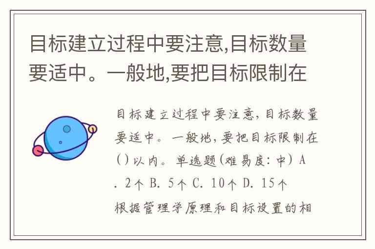 目标建立过程中要注意,目标数量要适中。一般地,要把目标限制在( )以内。单选题(难易度:中) A. 2个 B. 5个 C. 10个 D. 15个