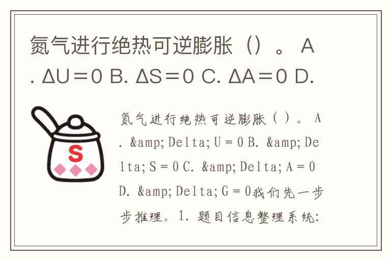 氮气进行绝热可逆膨胀()。 A. ΔU=0 B. ΔS=0 C. ΔA=0 D. ΔG=0