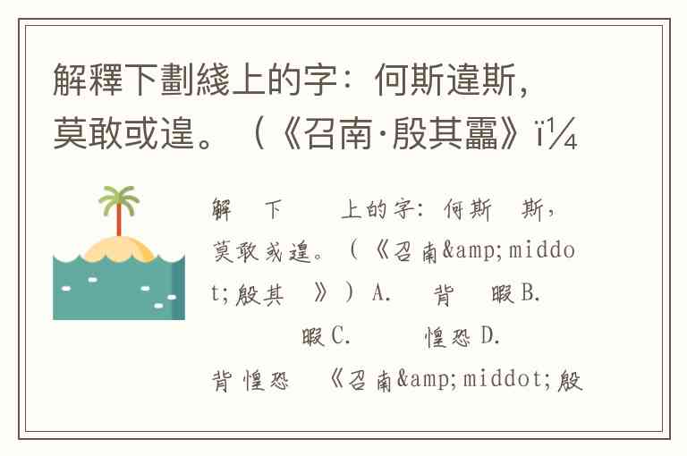 解釋下劃綫上的字:何斯違斯,莫敢或遑。(《召南·殷其靁》) A. 違背 閑暇 B. 離開 閑暇 C. 離開 惶恐 D. 違背 惶恐
