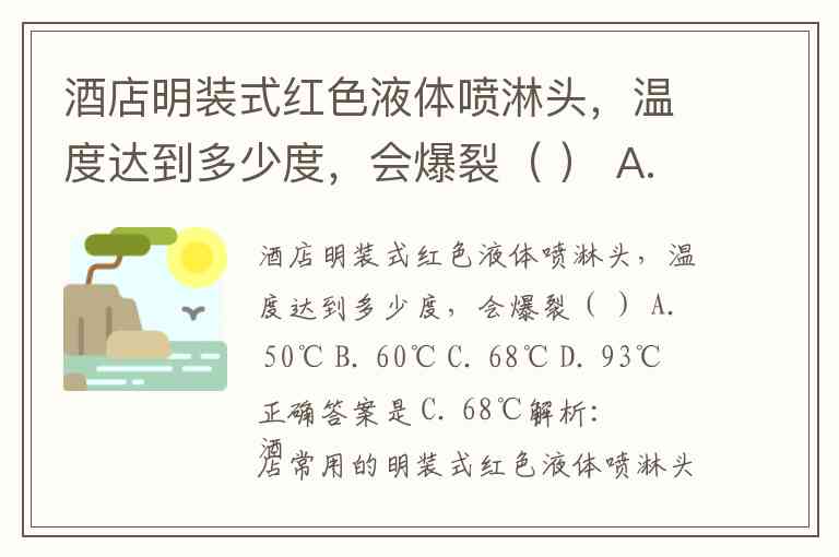 酒店明装式红色液体喷淋头,温度达到多少度,会爆裂( ) A. 50℃ B. 60℃ C. 68℃ D. 93℃