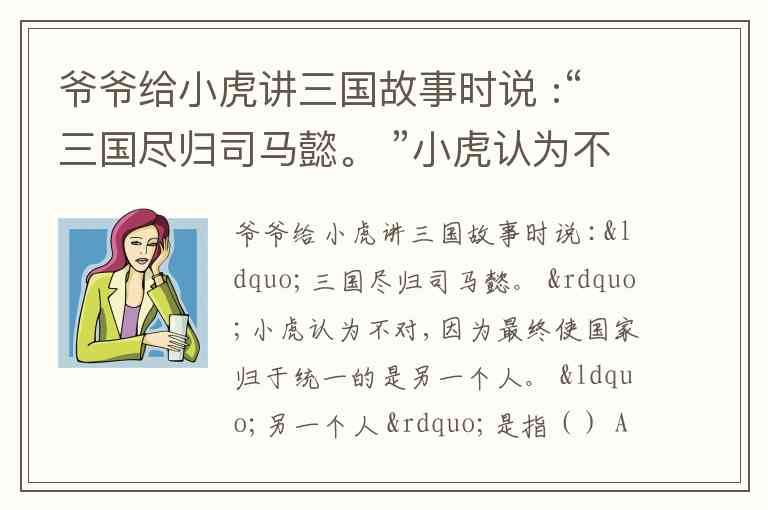 爷爷给小虎讲三国故事时说 :“三国尽归司马懿。 ”小虎认为不对,因为最终使国家归于统一的是另一个人。 “另一个人 ”是指() A. 司马迁 B. 司马昭 C. 司马炎 D. 司马睿