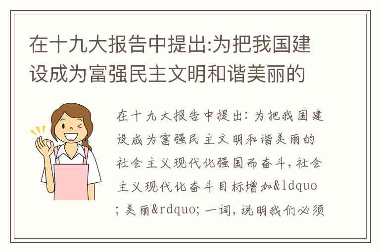 十九大报告中,在原有的“富强、民主、文明、和谐”社会主义现代化国家奋斗目标的基础上,加入了 “美丽” 一词,形成了 “富强民主文明和谐美丽” 的完整表述。