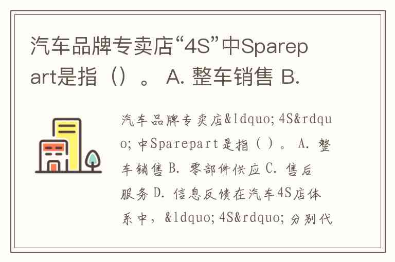 汽车品牌专卖店“4S”中Sparepart是指()。 A. 整车销售 B. 零部件供应 C. 售后服务 D. 信息反馈