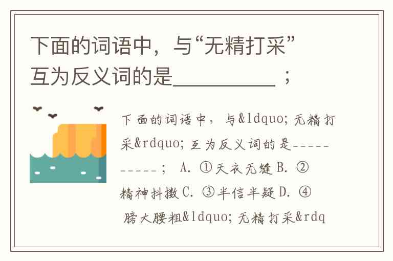 下面的词语中,与“无精打采”互为反义词的是__________ ; A. ①天衣无缝 B. ②精神抖擞 C. ③半信半疑 D. ④ 膀大腰粗