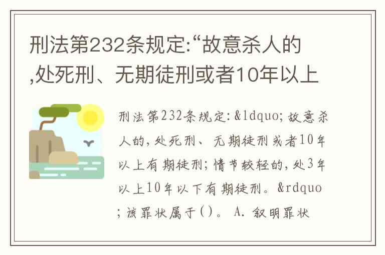 刑法第232条规定:“故意杀人的,处死刑、无期徒刑或者10年以上有期徒刑;情节较轻的,处3年以上10年以下有期徒刑。”该罪状属于( )。 A. 叙明罪状 B. 简单罪状 C. 引证罪状 D. 空白罪状