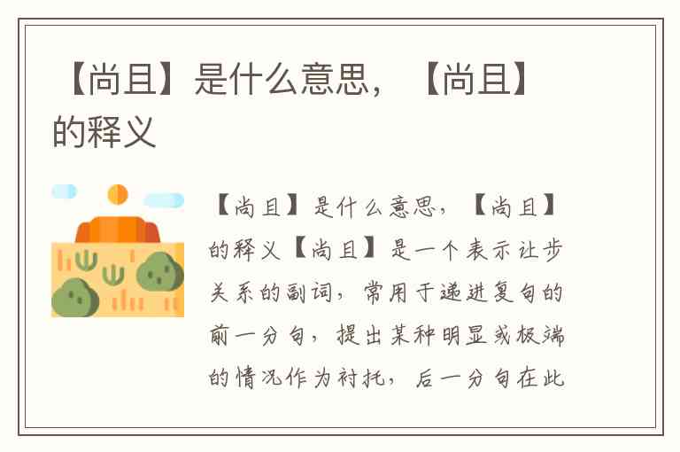 【尚且】是一个表示让步关系的副词,常用于递进复句的前一分句,提出某种明显或极端的情况作为衬托,后一分句在此基础上进一步推论,常与“何况”、“更”、“当然”、“就”等词语呼应。