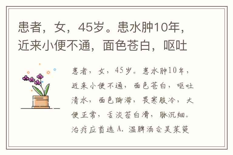 患者,女,45岁。患水肿10年,近来小便不通,面色苍白,呕吐清水,面色晦滞,畏寒肢冷,大便正常,舌淡苔白滑,脉沉细。治疗应首选 A. 温脾汤合吴茱萸汤 B. 舟车丸 C. 六味地黄丸 D. 乌头汤合二陈汤