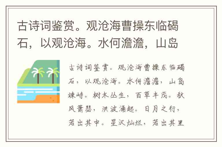 古诗词鉴赏。观沧海曹操东临碣石,以观沧海。水何澹澹,山岛竦峙。树木丛生,百草丰茂。秋风萧瑟,洪波涌起。日月之行,若出其中。星汉灿烂,若出其里。幸甚至哉,歌以咏志。下列分析正确的一项是( ) A. “东临碣石,以观沧海”两句,交代了观海的地点,起得平稳而质朴。“临”字统领全篇,以下几句皆由此展开,具体写登山之所见所思。 B. “水何澹澹,山岛竦峙”两句是从俯视的角度总写看到的景象,接下来四句则由远及近动静结合地描绘了山岛的蓬勃生机和大海的苍茫辽阔。 C. 诗中的两个“若”字,虚中有实,实中有虚,以奇特的想象,表现了大海吞吐日月星辰的气概,表达了诗人阔大的胸怀。 D. 全诗借景抒情,情景交融。登临碣石山,诗人心潮澎湃,把眼前的景色、自己的想象同历史兴衰之感、忧国忧民之情巧妙地融会在一起。