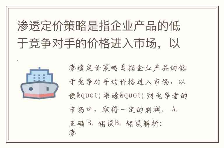 渗透定价策略是指企业产品的低于竞争对手的价格进入市场,以便"渗透"到竞争者的市场中,取得一定的利润。 A. 正确 B. 错误