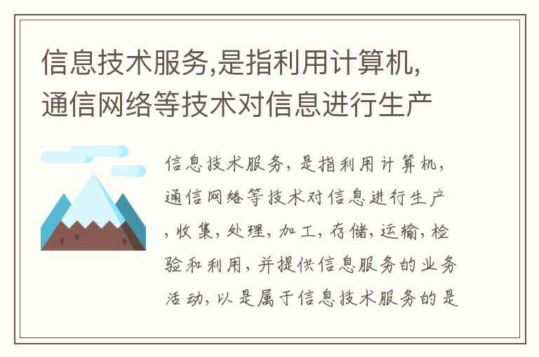 信息技术服务,是指利用计算机、通信网络等技术对信息进行生产、收集、处理、加工、存储、运输、检验和利用,并提供信息服务的业务活动。