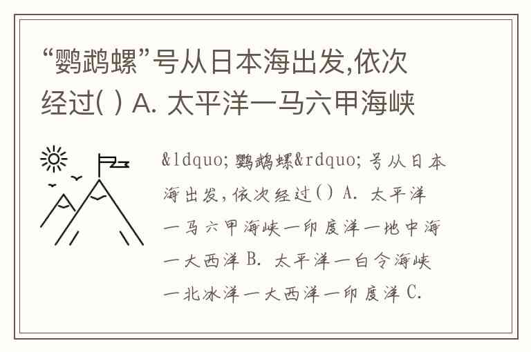 “鹦鹉螺”号从日本海出发,依次经过( ) A. 太平洋一马六甲海峡一印度洋一地中海一大西洋 B. 太平洋一白令海峡一北冰洋一大西洋一印度洋 C. 太平洋一马六甲海峡一印度洋一好望角一太平洋 D. 太平洋一白令海峡一大西洋一直布罗陀海峡一地中海