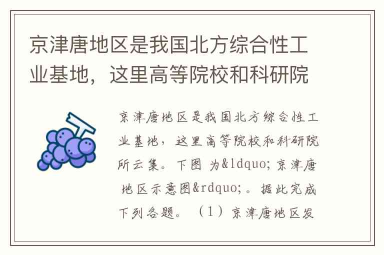 京津唐地区是我国北方综合性工业基地,这里高等院校和科研院所云集。下图 为“京津唐 地区示意图”。据此完成下列各题。 (1)京津唐地区发展工业的区位优势主要有 、 、 、 等。(2)滨海新区和曹妃甸工业区承接大城市的产业转移,对大城市产业结构和环境的积极意义分别是____________________________、____________________。(2 分)(3)新建工业区的工业集聚有利于企业共用 ,相互协作和技术创新,降低 ,集中处理废弃物等。(4)水资源短缺问题是制约京津唐地区社会经济发展的重要因素之一,请从开源、节流两个方面提出解决该地工业用水紧张的主要措施。 开源: ;节流: 。