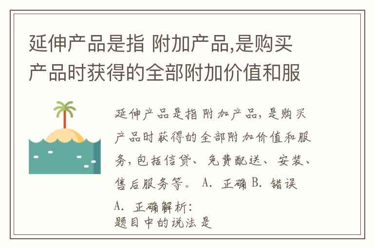 延伸产品是指 附加产品,是购买产品时获得的全部附加价值和服务,包括信贷、免费配送、安装、售后服务等。 A. 正确 B. 错误