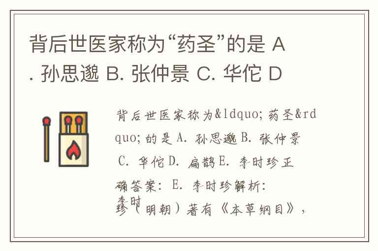 背后世医家称为“药圣”的是 A. 孙思邈 B. 张仲景 C. 华佗 D. 扁鹊 E. 李时珍