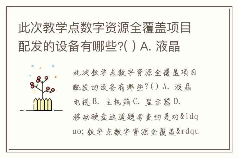 此次教学点数字资源全覆盖项目配发的设备有哪些?( ) A. 液晶电视 B. 主机箱 C. 显示器 D. 移动硬盘
