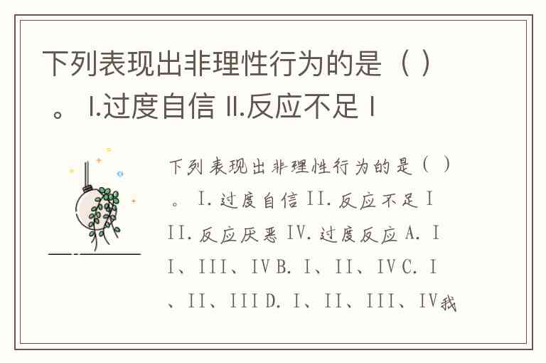 下列表现出非理性行为的是( ) 。 I.过度自信 II.反应不足 III.反应厌恶 IV.过度反应 A. II、III、IV B. I、II、IV C. I、II、III D. I、II、III、IV