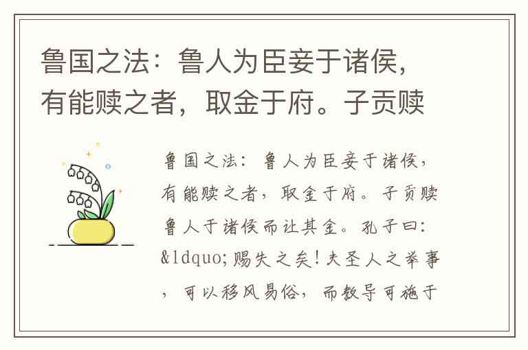 鲁国之法:鲁人为臣妾于诸侯,有能赎之者,取金于府。子贡赎鲁人于诸侯而让其金。孔子曰:“赐失之矣!夫圣人之举事,可以移风易俗,而教导可施于百姓,非独适己之行也。今鲁国富者寡而贫者多,取其金则无损于行,不取其金,则不复赎人矣。” 21.下列关于子贡的说法错误的一项是( ) A. 子贡复姓端木,名赐,字子贡。 B. 子贡很会做生意,被后人称为“儒商鼻祖” C. 文段中的子贡是一个高风亮节、助人为乐、考虑周全的人。 D. 子贡是“孔门十贤”之一。