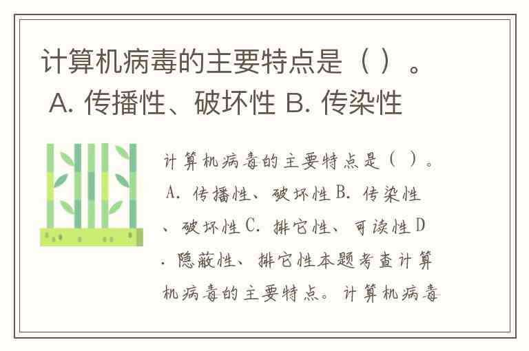 计算机病毒的主要特点是( )。 A. 传播性、破坏性 B. 传染性、破坏性 C. 排它性、可读性 D. 隐蔽性、排它性
