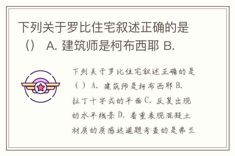 下列关于罗比住宅叙述正确的是() A. 建筑师是柯布西耶 B. 拉丁十字式的平面 C. 反复出现的水平线条 D. 着重表现混凝土材质的质感