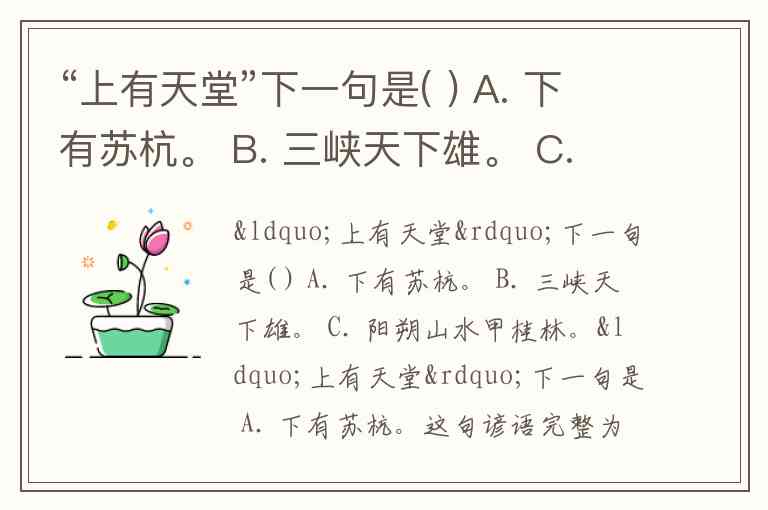 “上有天堂”下一句是( ) A. 下有苏杭。 B. 三峡天下雄。 C. 阳朔山水甲桂林。