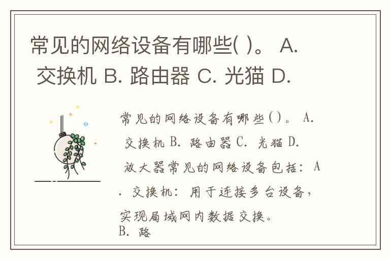 常见的网络设备有哪些( )。 A. 交换机 B. 路由器 C. 光猫 D. 放大器