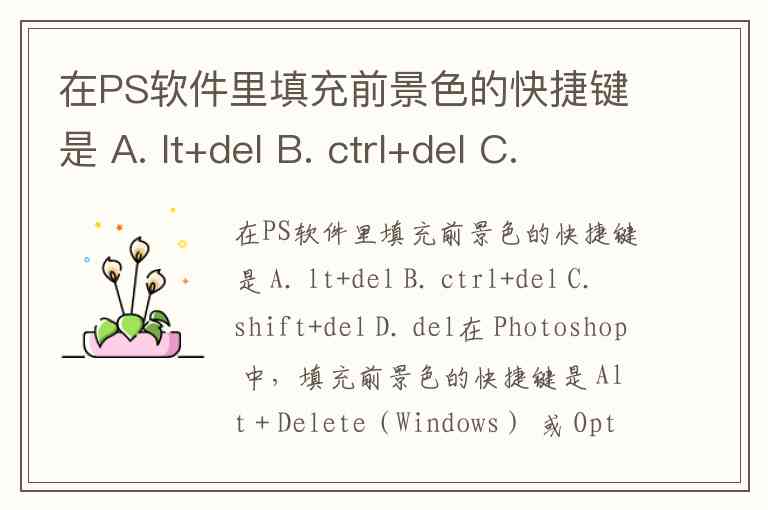 在PS软件里填充前景色的快捷键是 A. lt+del B. ctrl+del C. shift+del D. del