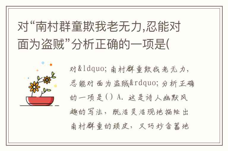 对“南村群童欺我老无力,忍能对面为盗贼”分析正确的一项是( ) A. 这是诗人幽默风趣的写法,既活灵活现地描绘出南村群童的顽皮,又巧妙含蓄地刻画了自己因年迈而无力改变现状的那种无可奈何的微妙心理。 B. 南村群童竟然不知道“我”是著名的“诗圣”,表达了“我”对他们年少无知的不满。 C. 南村群童连不值钱的茅草都抢,可见当时人们的生活贫困到了何种程度。 D. 称之为“盗贼”,表达了诗人对南村群童不良行为的强烈愤恨。