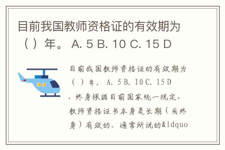 目前我国教师资格证的有效期为( )年。 A. 5 B. 10 C. 15 D. 终身