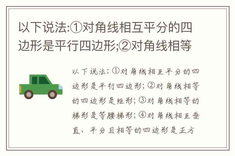 ② 对角线相等的四边形是矩形 —— 错误,反例:等腰梯形对角线相等,但不是矩形。