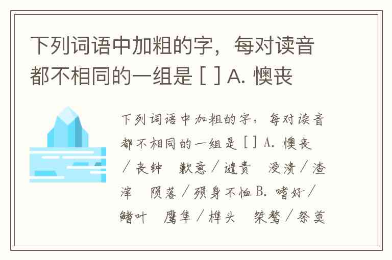 下列词语中加粗的字,每对读音都不相同的一组是 [ ] A. 懊丧/丧钟 歉意/谴责 浸渍/渣滓 陨落/殒身不恤 B. 嗜好/鳍叶 鹰隼/榫头 桀骜/祭奠 更加/更相为命 C. 酣畅/猖獗 积攒/攒射 踌躇/踯躅 枕藉/声名狼藉 D. 萌蘖/罪孽 挣揣/揣测 尸骸/垓心 强颜/强弩之末