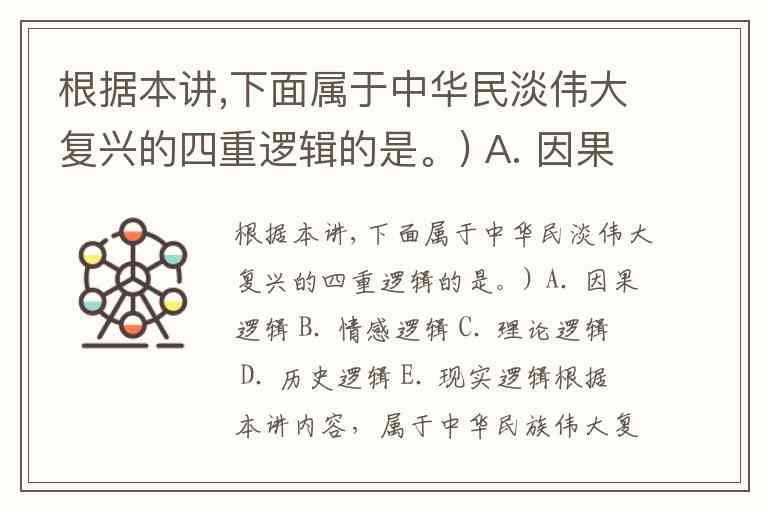 根据本讲,下面属于中华民淡伟大复兴的四重逻辑的是。) A. 因果逻辑 B. 情感逻辑 C. 理论逻辑 D. 历史逻辑 E. 现实逻辑