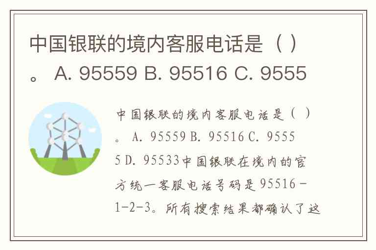 中国银联的境内客服电话是( )。 A. 95559 B. 95516 C. 95555 D. 95533